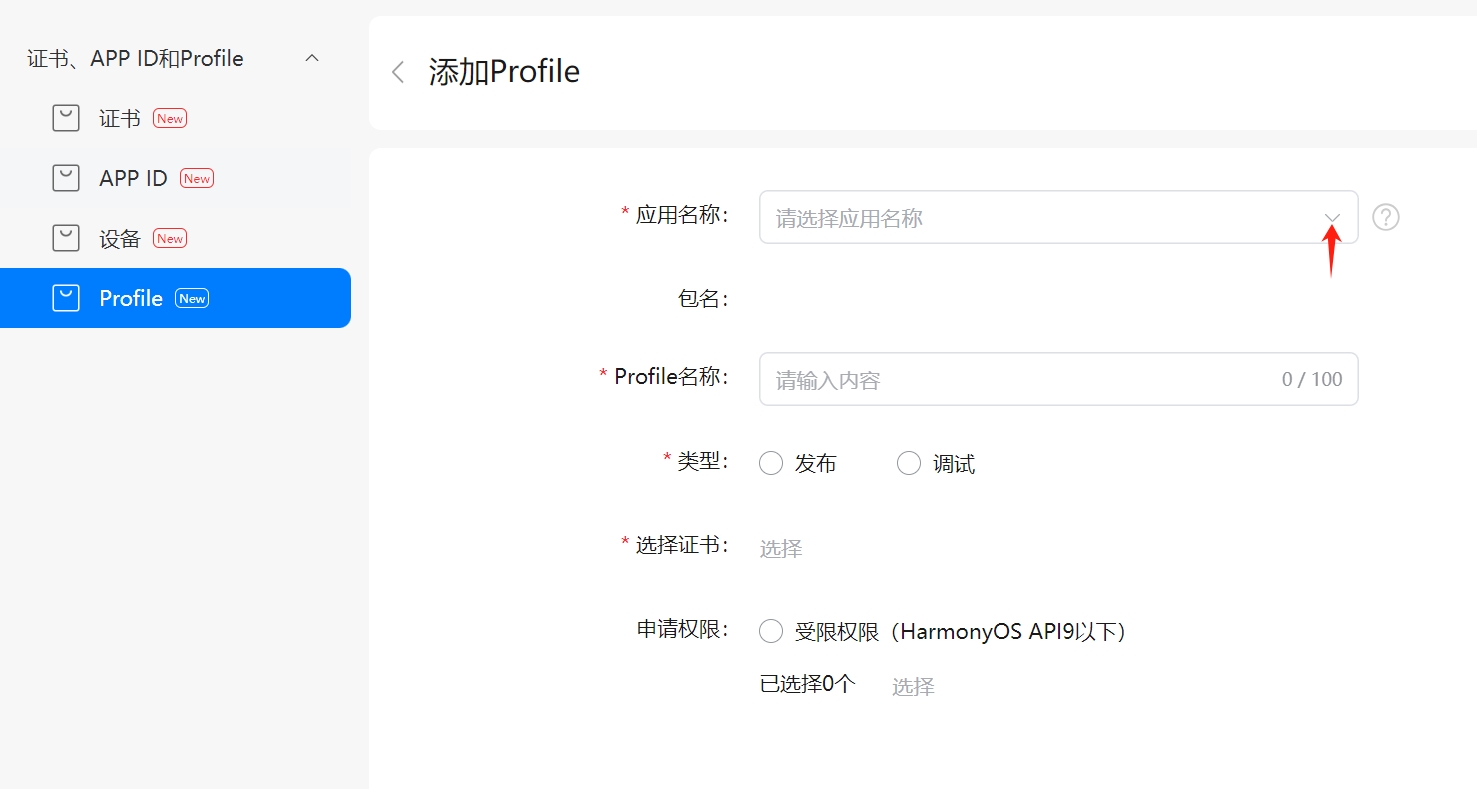 选择在APP ID那里创建的应用,输入Profile文件,选择类型,证书选择上传的证书