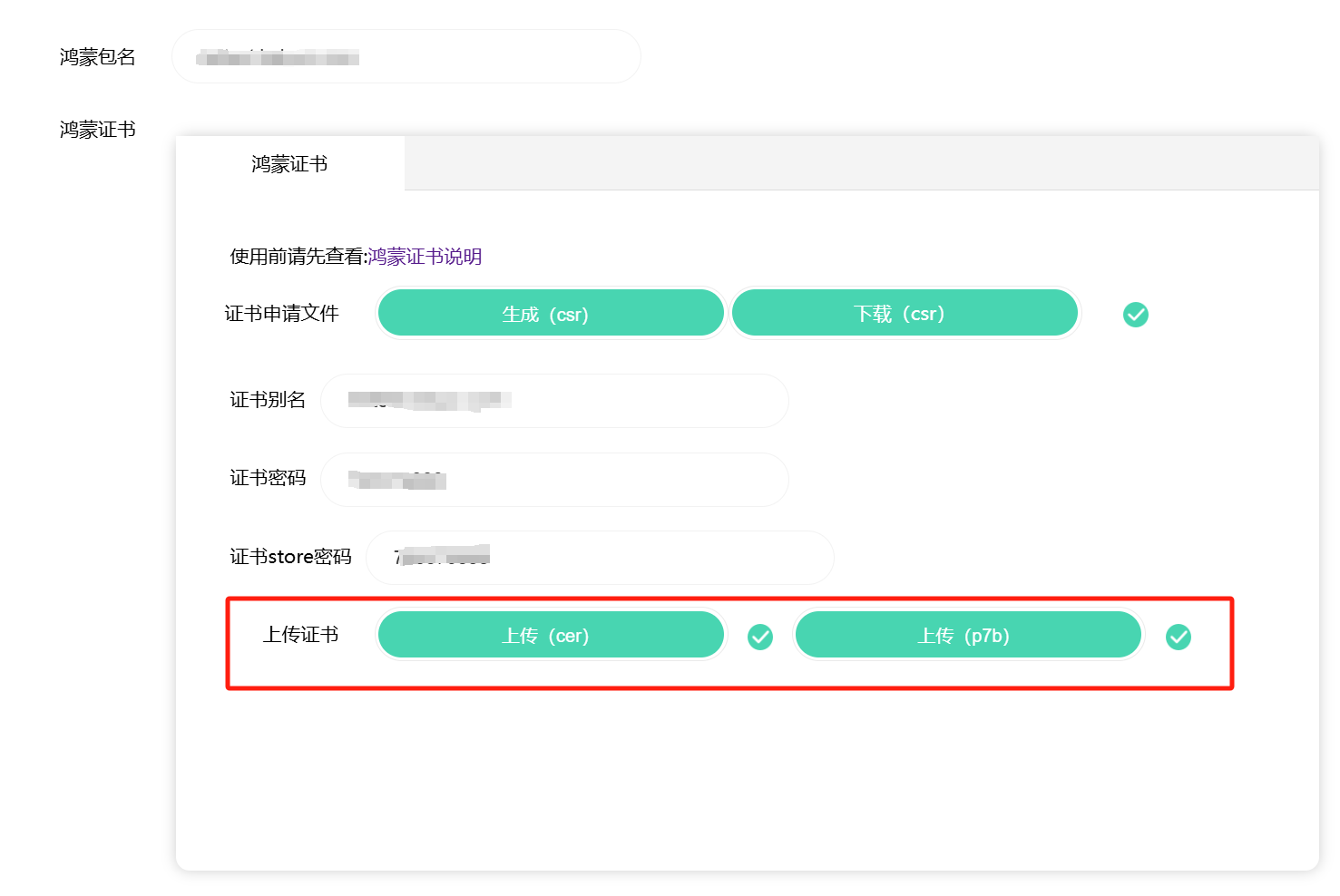 在APP配置页面,点击证书,在右侧找到鸿蒙证书配置的部分